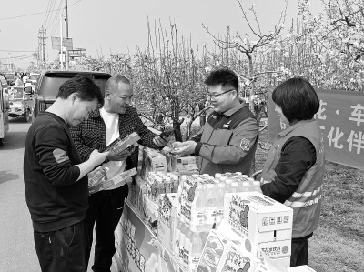 近日,河南省商丘市宁陵县梨花节开幕,河南商丘石油组织志愿者走进活动现场,开展志愿服务与品牌推广活动。志愿者规范陈列易捷特色商品,向游客推介优质商品、讲解优惠政策,贴心服务游客,受到好评。图为商丘石油员工为游客推介易捷商品。陈晶晶 摄