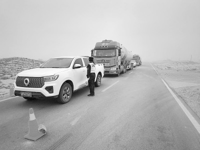 进入春季以来,顺北油气田所在区域强沙尘暴天气频发。西北油田治安消防中心及时启动极端天气专项应急预案,加密顺北主干道等重点路段交通管控,全力保障油田运输供应安全。图为近日沙尘暴天气中,该中心特勤四队治安员在道路上分段疏导交通。杨东辉 摄